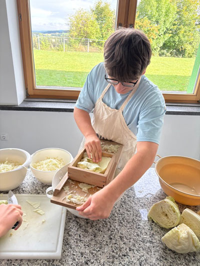 Die fast vergessene Kunst des „Fermentierens“ ist nun wieder voll im Trend! Deswegen stellten die 4.Klasse Sauerkraut her. In ca. 8 Wochen kann es verköstigt werden!